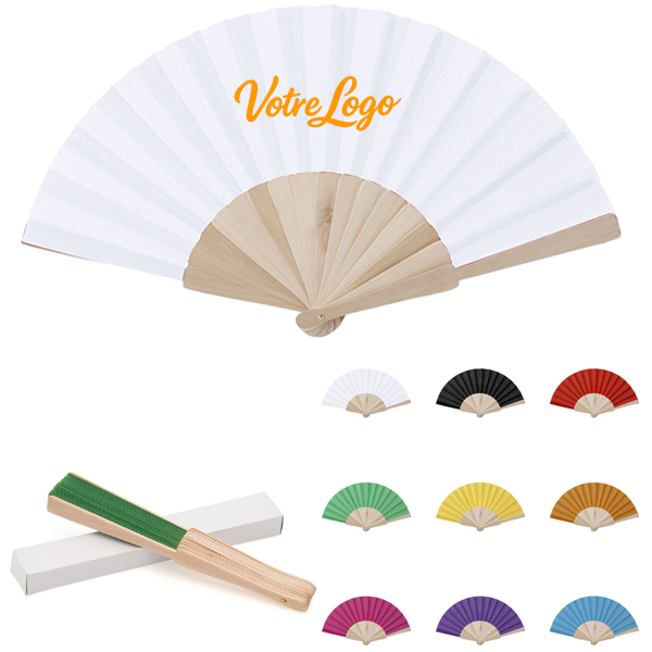 Éventail publicitaire personnalisable voile en tissu polyester (9 coloris) et baguettes en bois