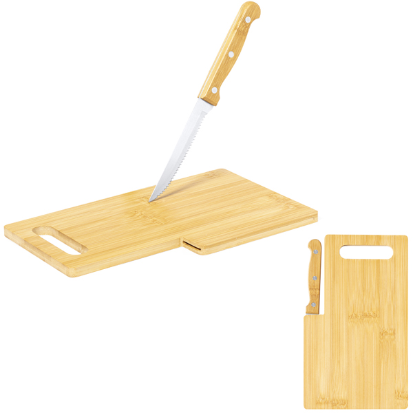 Planche à découper avec couteau en acier inoxydable intégré, personnalisable par gravure ou impression de votre logo et ou texte