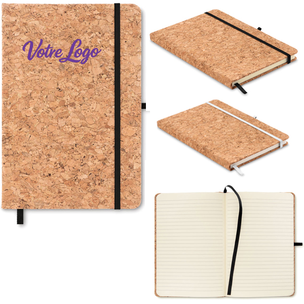 Carnet A5 avec couverture liège personnalisable logo et ou texte, 192 pages lignées (96 feuilles en papier recyclé), fermeture par bande élastique (noire ou blanche), ruban marque-page et porte stylo