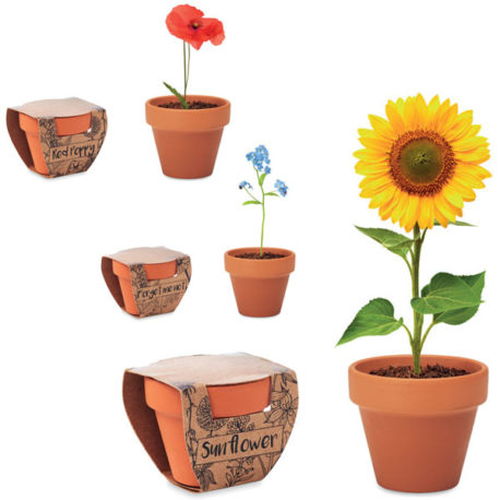 Pot de graine à semer personnalisable avec votre logo et ou texte, la boîte contient un petit pot en terre cuite avec soit des graines de myosotis ou coquelicot ou tournesol , tablette de terreau incluse